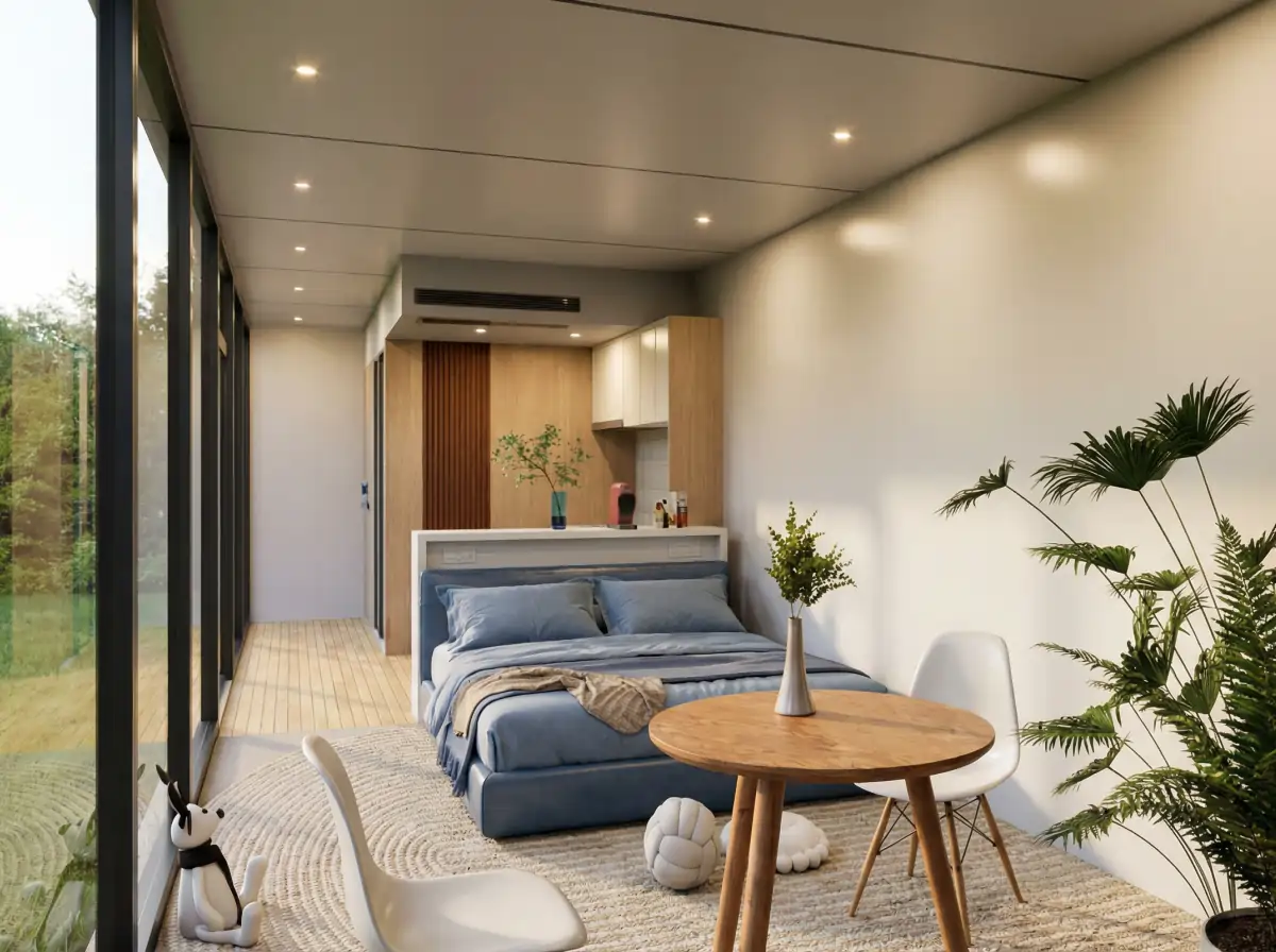 Gdy solidna konstrukcja jest już gotowa, jej sercem staje się wnętrze – przemyślane, jasne i zapraszające. Do środka T-House wpada mnóstwo naturalnego światła przez duże, zespolone szyby, które nie tylko otwierają widok na otoczenie, ale także stanowią integralną część energooszczędnej powłoki budynku. Naturalne materiały wykończeniowe, takie jak europejska deska sosnowa i matowe powierzchnie, tworzą ciepłą, minimalistyczną atmosferę. Przestronny, otwarty układ pozwala na swobodną aranżację, a każdy detal – od wbudowanego oświetlenia LED po praktyczne rozwiązania przechowywania – został zaprojektowany z myślą o codziennym komforcie. To więcej niż ściany i dach; to gotowa scenografia dla Twojego życia.